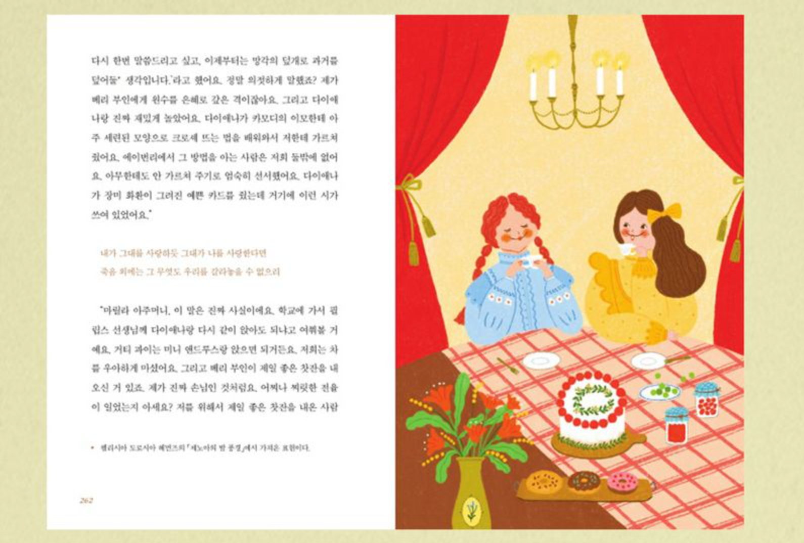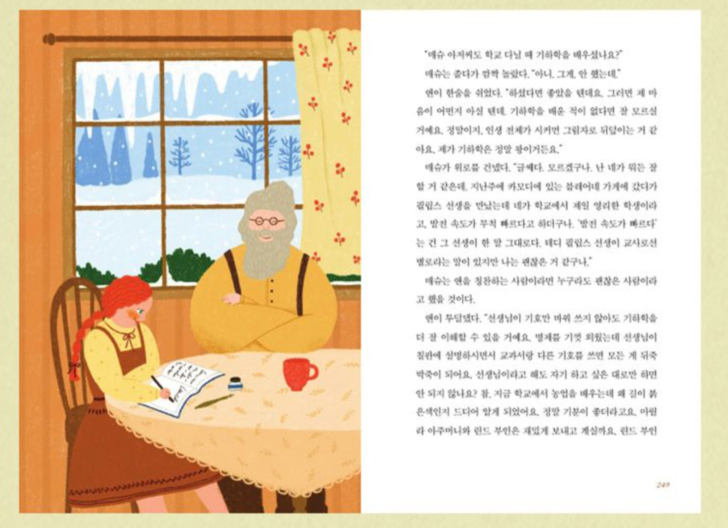 En particular, la fortaleza de Seoljji para capturar la textura del lápiz de color está bien representada en este libro. La diversidad de las estaciones del año en la ciudad de Avonlea y la expresión cambiante de Anne en diferentes situaciones están llenas de diversión. La característica pintura de Seoljji, que llena una página de calidez y felicidad, parece reflejar la personalidad positiva de Anne. Las ilustraciones, repletas de calidez y felicidad, son razón suficiente para elegir "Anne, la de techo verde" de Art & Classic.