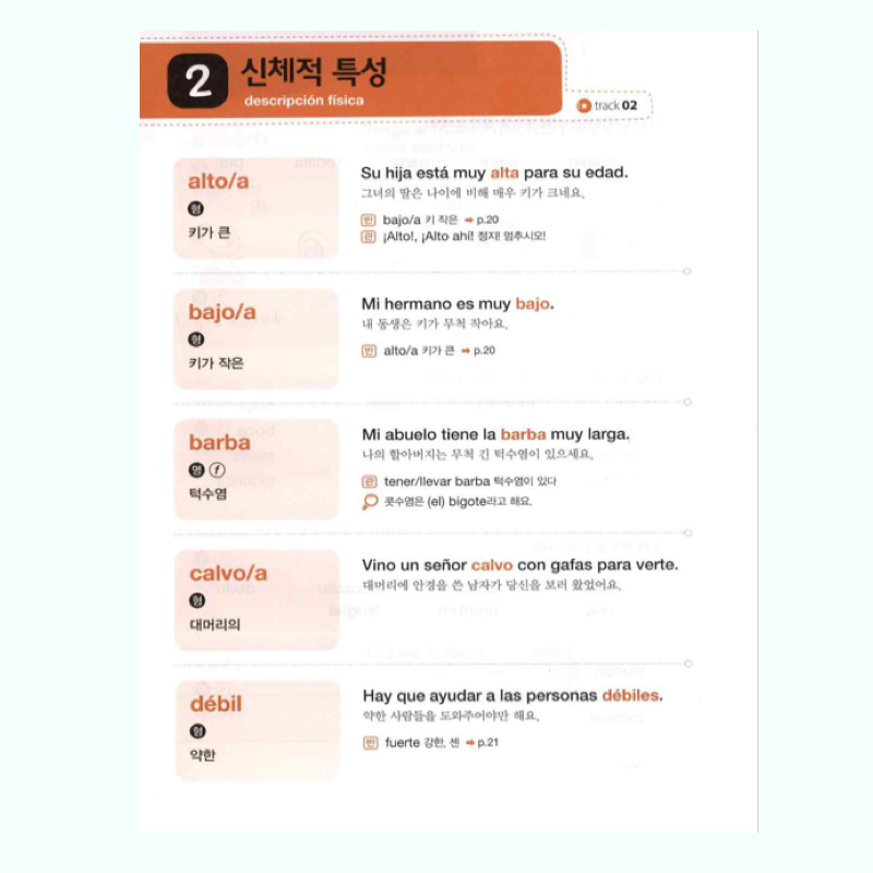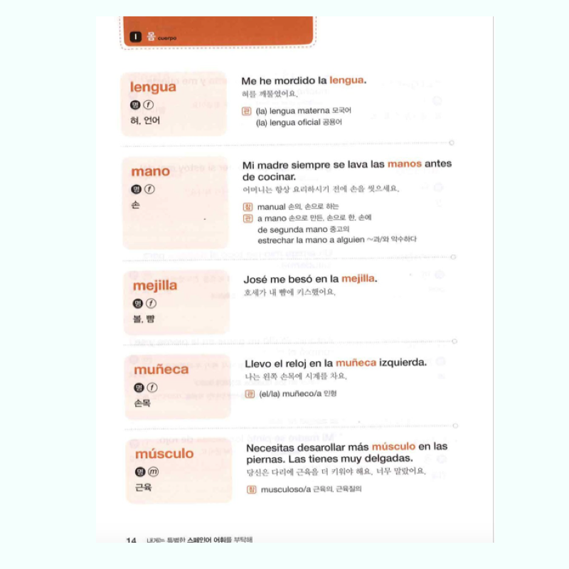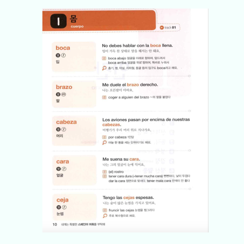 Es un libro de vocabulario de Español para Coreanos. Incluye vocabulario de Coreano a Español, organizado por categorías y frases de uso común. Por ejemplo: Ser humano, partes del cuerpo, carácter, salud, comida, sabores, tiendas, restaurantes, naturaleza, universo, tierra, geografía, plantas, medio ambiente, cultura, Tiempo libre, entre otros.